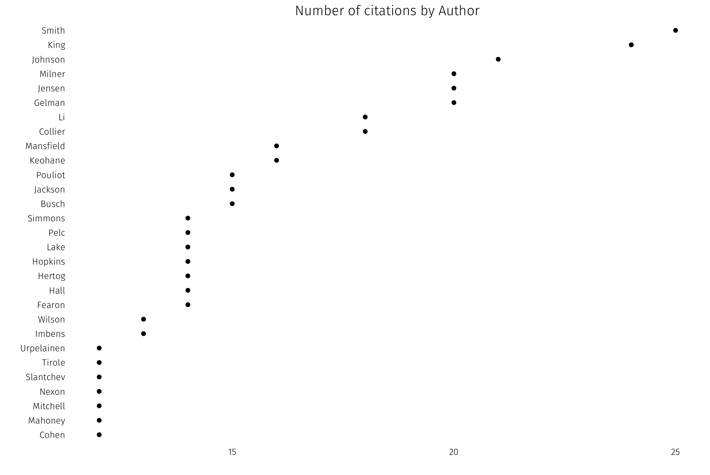 How about most-cited authors? I’ll plot all authors in the library with 12 or more citations. This requires a bit of data work, as the original file puts all authors in one column. First, separate coauthors into their own columns, then gather back into long format: