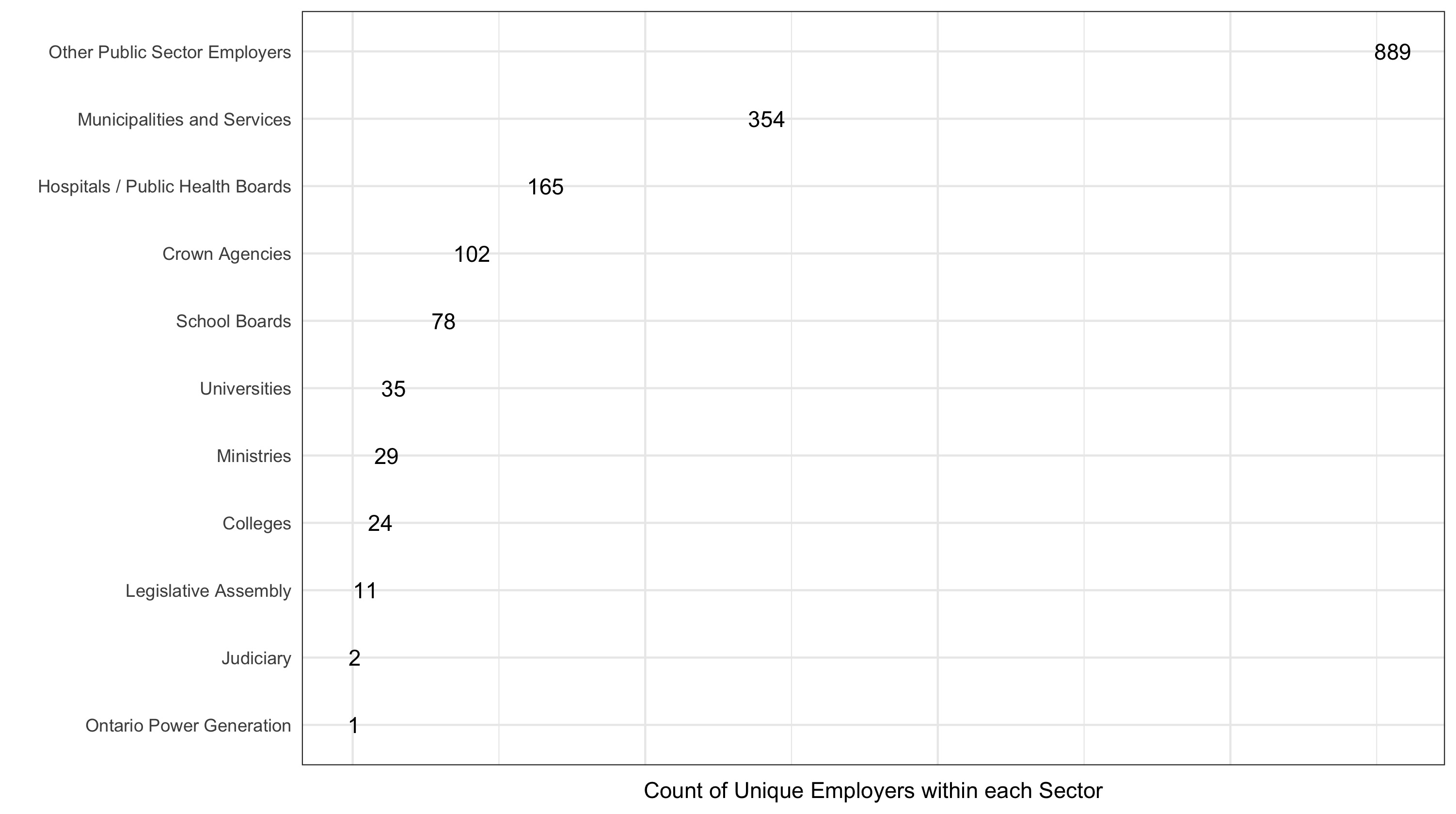 We now have a clean dataset where every row is an Ontario public sector employee. Let’s take a look.