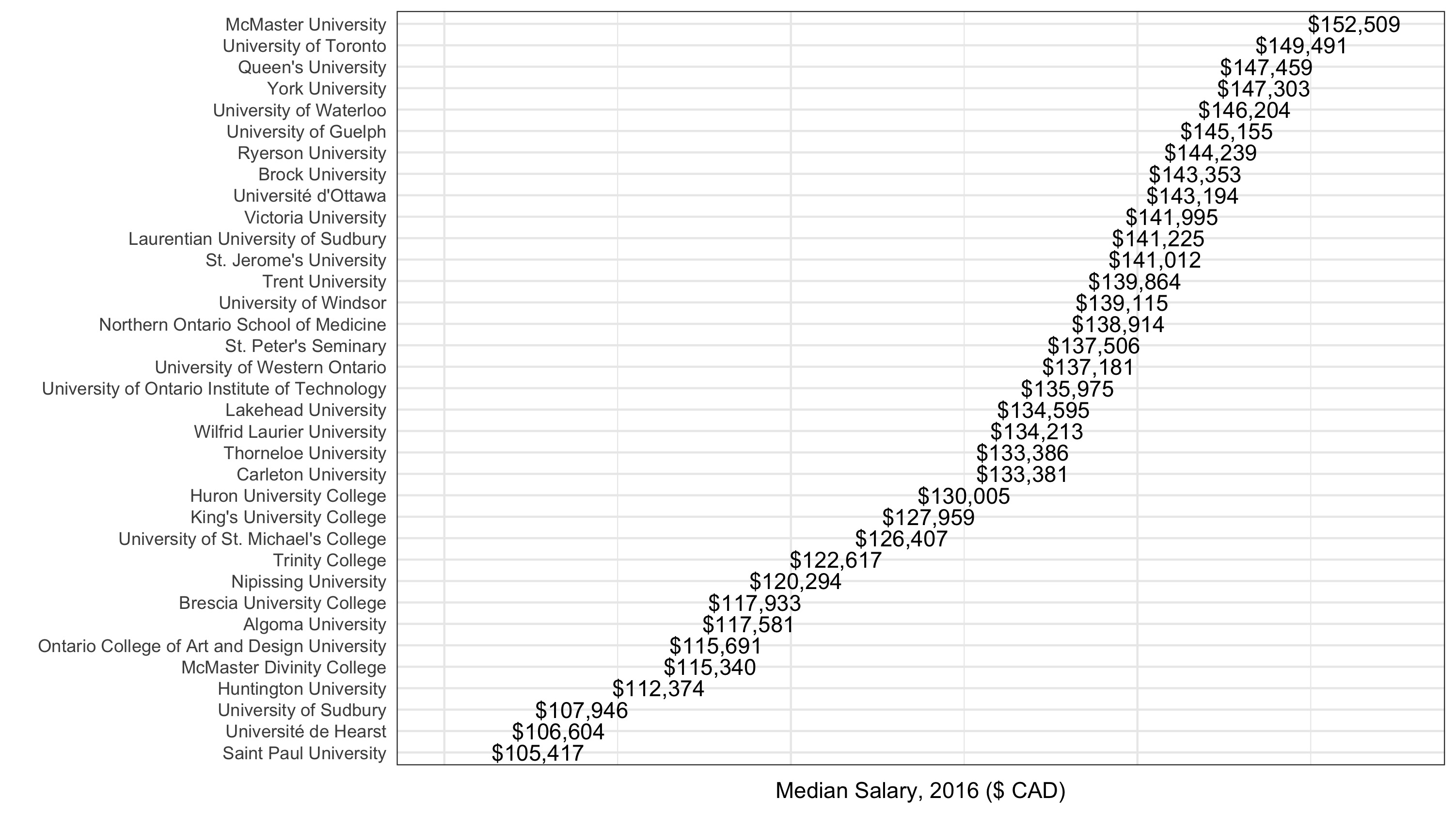 I’m interested in universities in particular. What is the median salary at each Ontario university?